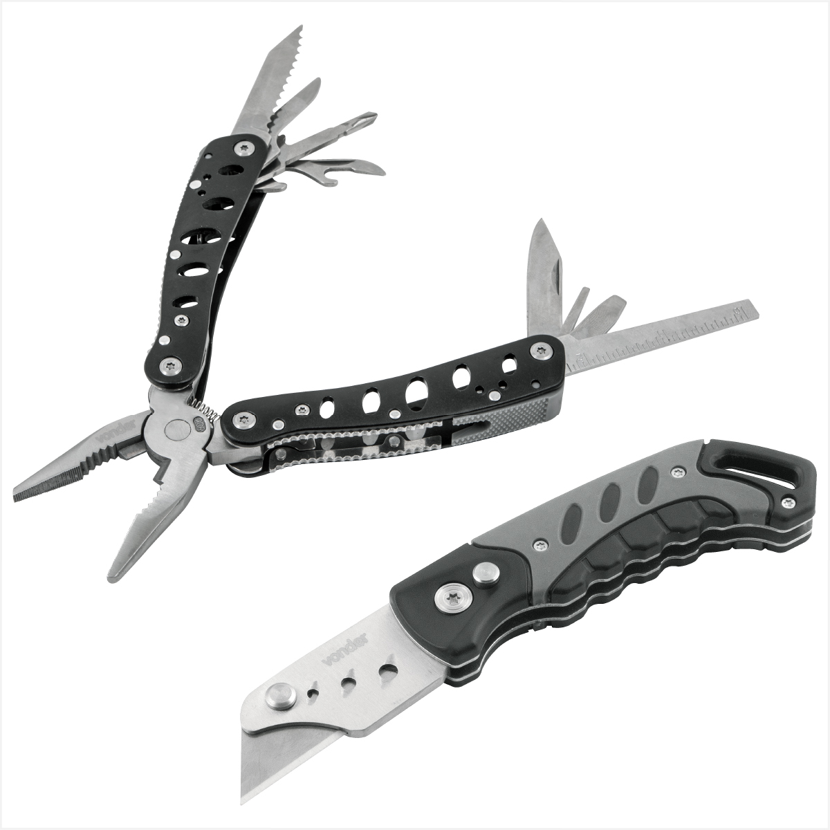 Indicado para inúmeras funções. Uso leve. Lâmina para reposição no estilete: 35.99.000.002. Alicate canivete com o corpo em aço inox, proporcionando maior resistência à oxidação/corrosão. Estilete com botão de travamento da lâmina, conferindo maior segurança, além de lâmina trapezoidal substituível.