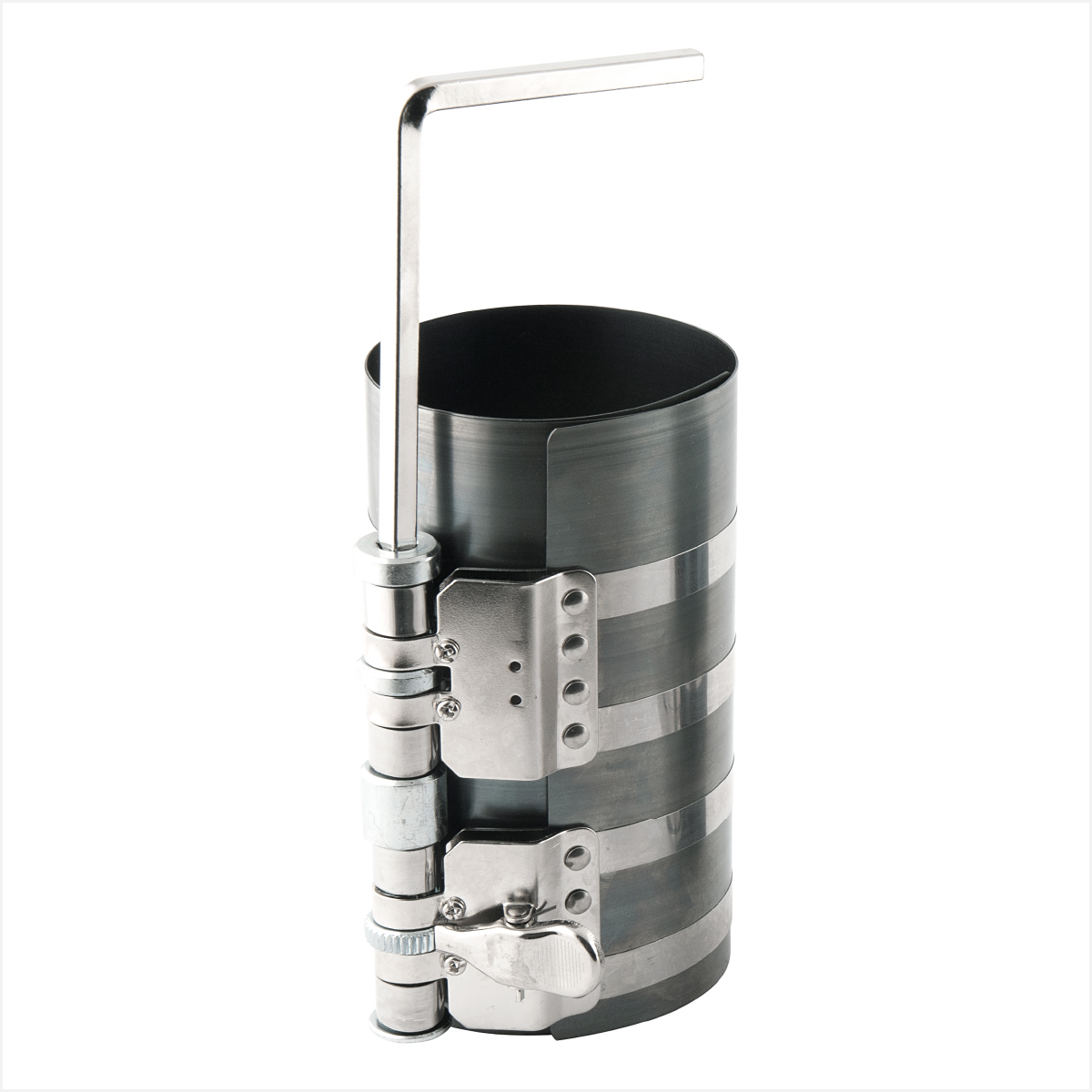 Indicada para comprimir anéis de pistão na montagem de motores. Cinta confeccionada em aço mola especial e demais componentes em aço zincado.
