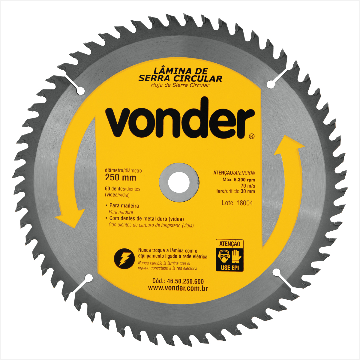 Indicada para cortar madeiras. Nunca exceder a rotação máxima (rpm) - risco de acidente e/ou queima da lâmina. Não cortar madeiras impregnadas com massa ou cimento. Para cortes em MDF, a vida útil da serra e o nível de qualidade do acabamento serão reduzidos. A Vonder disponibiliza em seu mix, serras apropriadas para cortes em MDF. Corpo em aço carbono com dentes de metal duro/vídea que proporcionam maior vida útil.