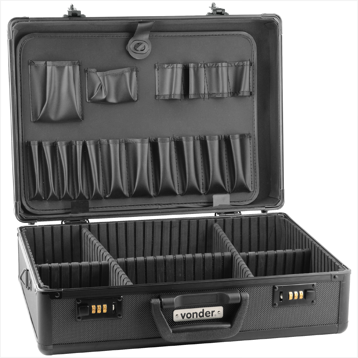 Possui estrutura rígida revestida externamente em alumínio na cor preta, além de cantos plásticos e laterais reforçadas com cantoneira de alumínio, conferindo maior durabilidade. Revestida internamente com material sintético macio (EVA), com 5 divisões internas removíveis e ajustáveis que adequam-se a diferentes tamanhos e formatos de ferramentas. Acompanha porta-ferramentas removível e alça auxiliar em nylon. Contém fechadura com segredo personalizável.
