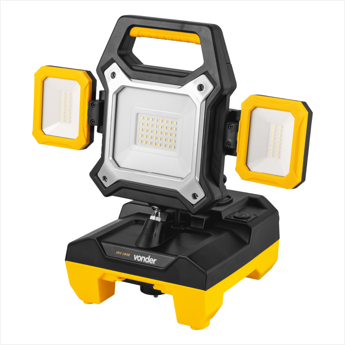 Este equipamento utiliza um modelo de bateria que pode ser intercambiável (não acompanha), ou seja, uma bateria que é compatível com outros modelos de ferramentas a bateria VONDER. Por isso, em sua próxima compra de ferramenta a bateria VONDER, procure um modelo que comece com a referência "I", ou que esteja identificado com o selo "Bateria Intercambiável VONDER". Desta forma, você garante modelos mais econômicos, sem a necessidade de aquisição de novas baterias e carregadores para uso em seu equipamento. Leve, prático e portátil, possui gancho para pendurar, alça para transporte com revestimento emborrachado e sistema giratório 360º, que permite mudar a direção do refletor principal e laterais, adequando-se de acordo com a necessidade do usuário e proporcionando facilidade e eficiência na utilização. Conta ainda com adaptador com rosca M6 em sua base, podendo ser fixado a um tripé (não acompanha).