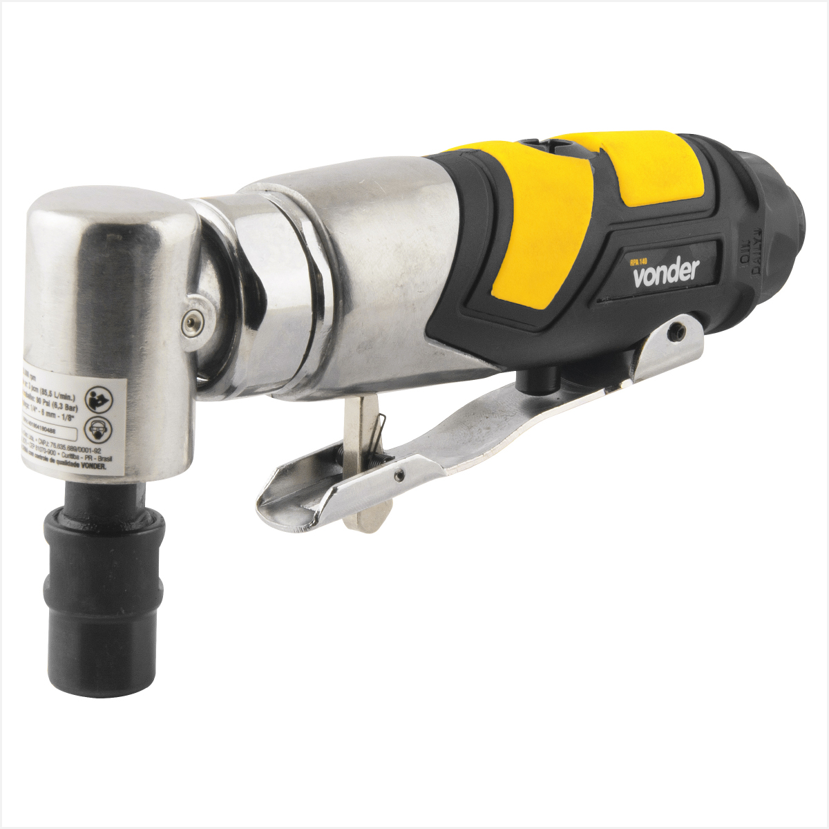 Indicada para operações de acabamento com o auxílio de acessórios adequados à rotação da máquina. Manter a ferramenta constantemente lubrificada e utilizar sempre o regulador de pressão e o lubrificador de linha com óleo pneumático. Possui corpo em alumínio com cobertura emborrachada, proporcionando maior resistência e conforto durante o manuseio, além de ponta em ângulo, que confere maior facilidade para realizar trabalhos em locais de difícil acesso.